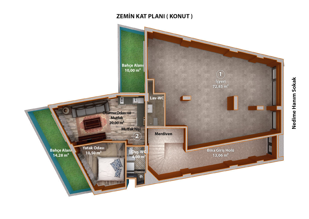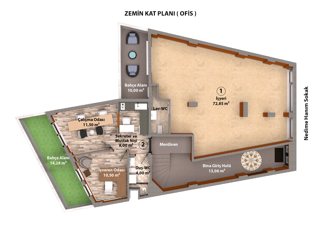 | 1 | İşyeri | 72,85 m2 | SATILDI | Zemin Kat | Avukat / Noter |